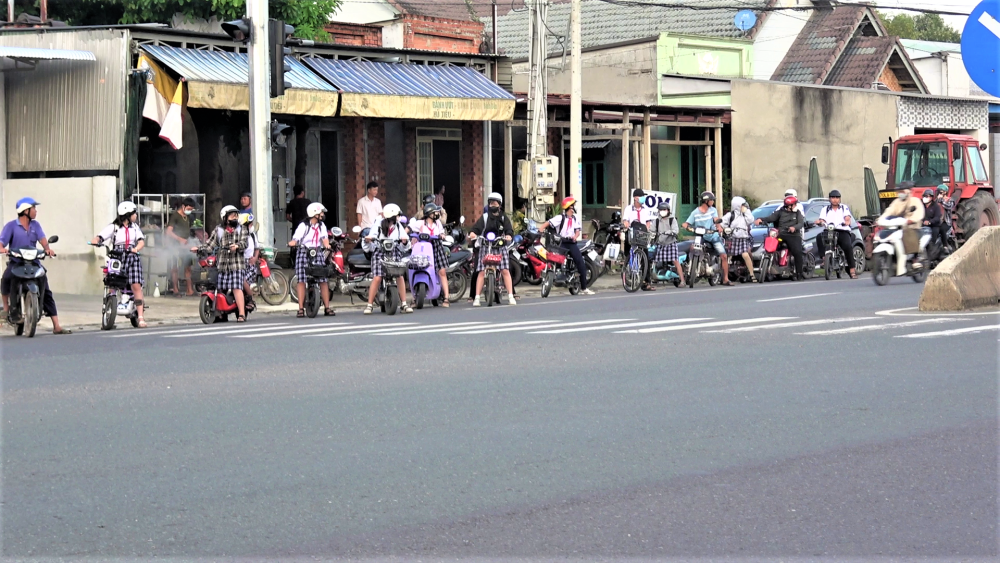Học sinh muốn rẽ trái sang đường phải dừng xe chờ đợi khá lâuNhiều em học sinh nôn nóng sang đường, rất không an toàn