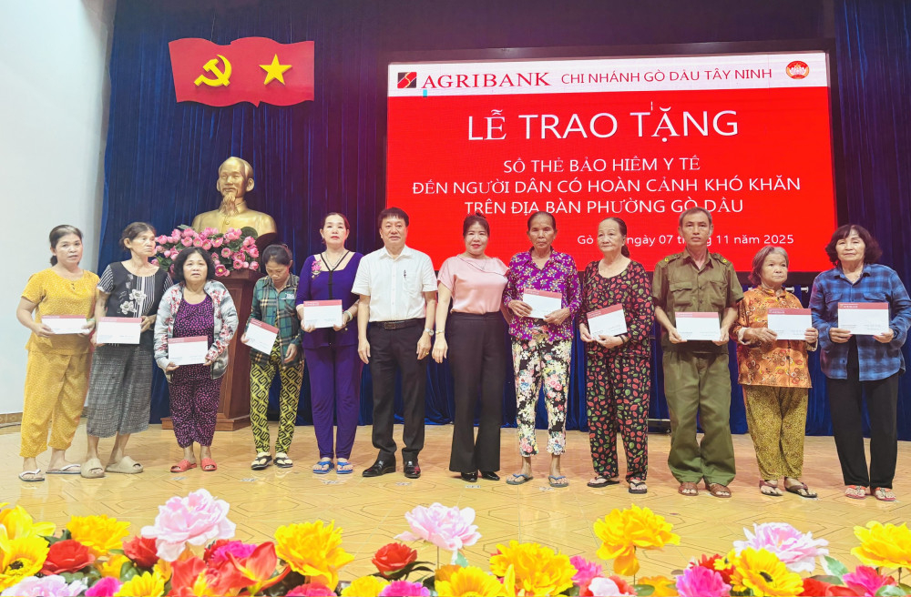 Lãnh đạo phường và lãnh đạo Agribank chi nhánh Gò Dầu trao tặng 50 sổ thẻ bảo hiểm y tế cho người dân có hoàn cảnh khó khăn trên địa bàn phường.