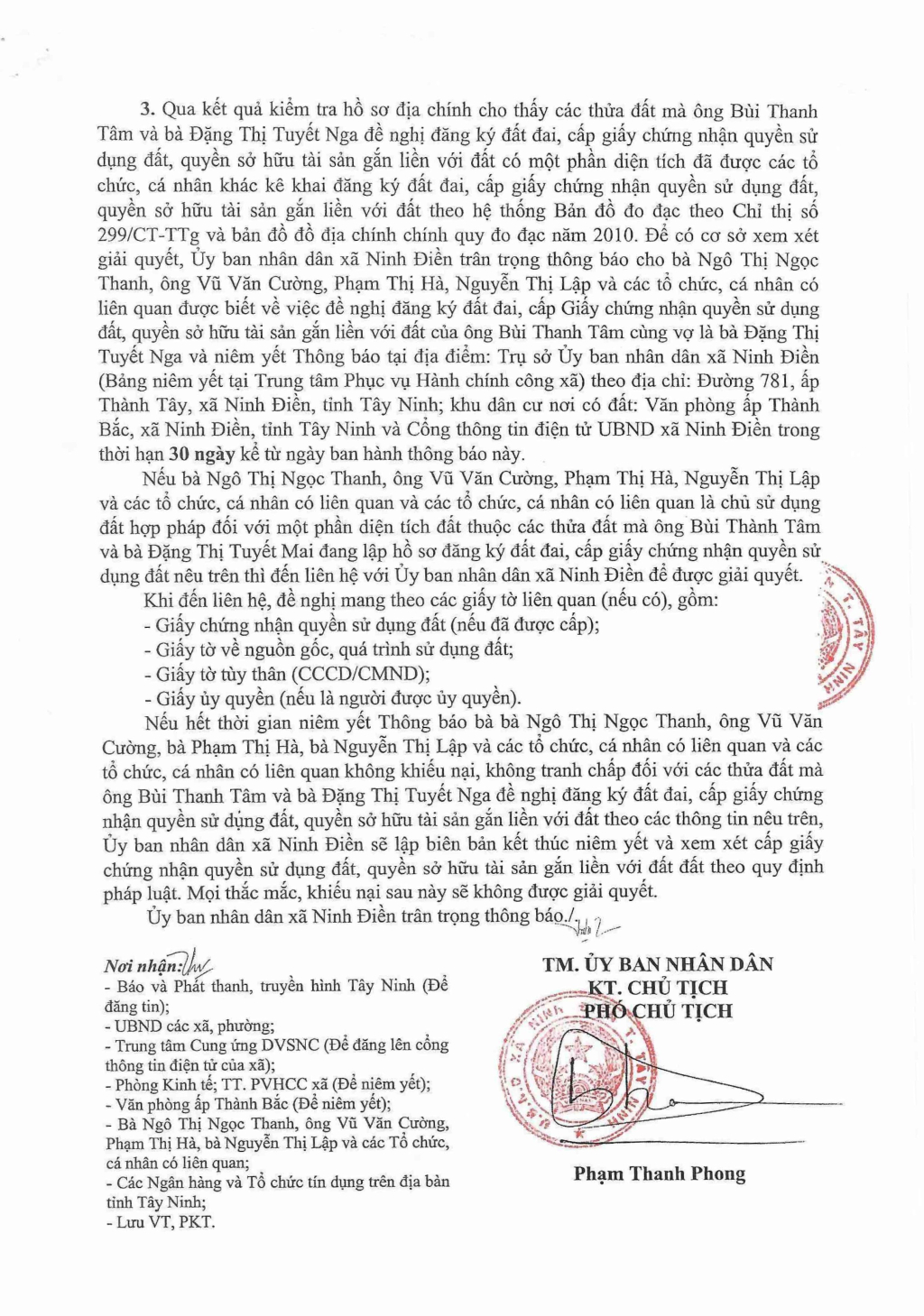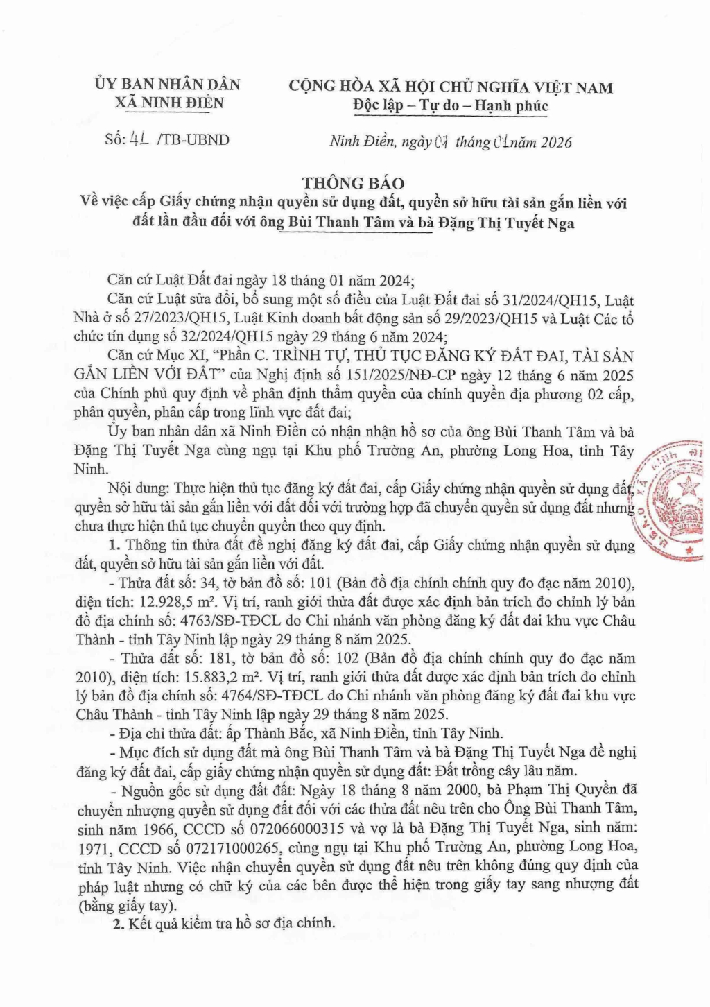 Thông báo về việc cấp Giấy chứng nhận quyền sử dụng đất, quyền sở hữu tài sản gắn liền với đất lần đầu đối với ông Bùi Thanh Tâm và bà Đặng Thị Tuyết Nga